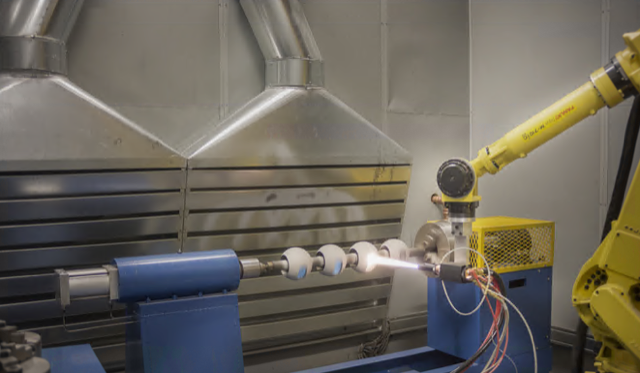 Thermal Spray handling equipment comes in many shapes and forms. We refer to anything that handles the part or the gun as handling equipment.  Below you can see various ways to handle the part, the gun, the smoke, and the heat in thermal spray processes.